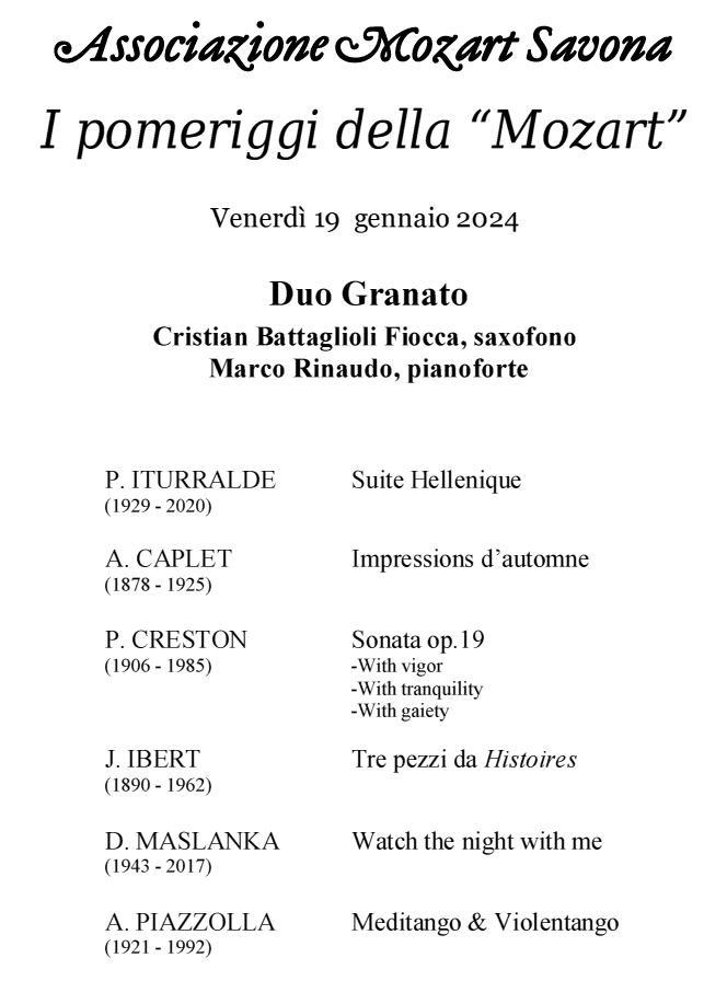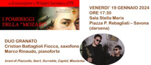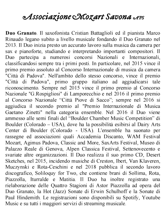 I pomeriggi della Mozart: DUO GRANATO (Cristian Battaglioli Fiocca, saxofono – Marco Rinaudo, pianoforte) [Sala Stella Maris – Savona]